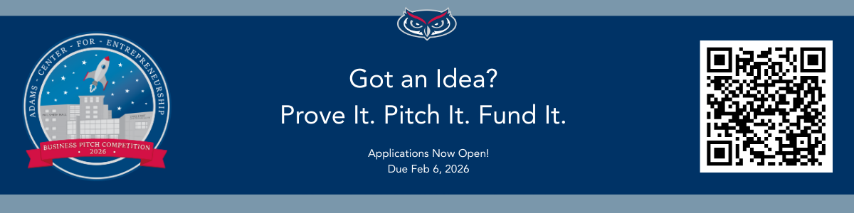The annual Florida Atlantic Business Pitch Competition is hosted by the College of Business and the Adams Center for Entrepreneurship with support from local partners and sponsors. The competition is open to Florida Atlantic students and community members and features multiple tracks, including a Veteran Track, The Runway Accelerator Track, and a Spanish-Language Track. Participants pitch their game-changing ideas for a chance to secure seed funding for their new ventures, with finalists competing for cash prizes and preferred access into the Florida Atlantic The Runway Venture Program. Throughout the competition, founders have the opportunity to present to local angel and venture capital groups, connect with successful entrepreneurs, and access resources that support the creation and growth of their businesses.